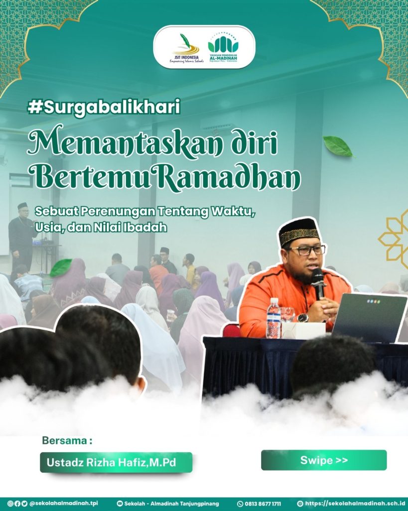 Yayasan Pendidikan Al-Madinah kembali menggelar kegiatan Surga Balek Hari pada Jumat, 06 Februari 2026, dengan mengusung tema “Memantaskan Diri Menjadi Tamu Ramadhan, Sebuah Perenungan tentang Waktu, Usia, dan Nilai Ibadah.” Kegiatan ini diisi oleh Ustadz Rizha Hafiz, M.Pd., yang menyampaikan tausiyah penuh makna sebagai bekal ruhiyah dalam menyambut bulan suci Ramadhan.