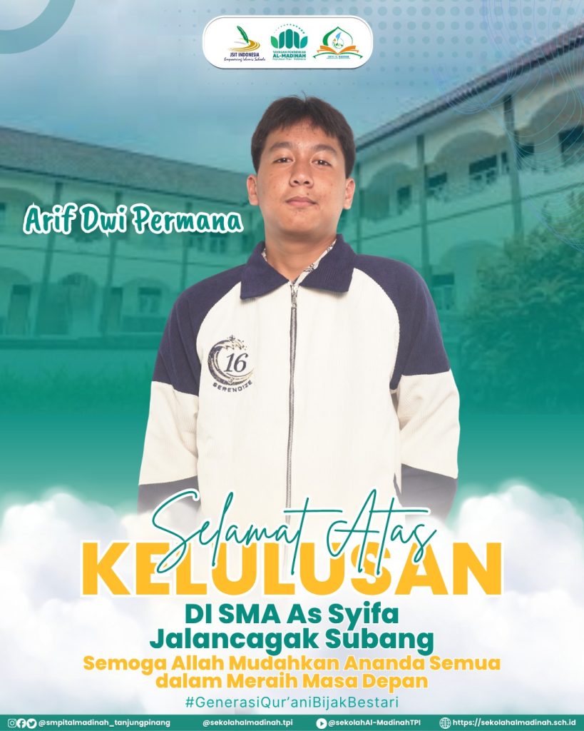 Kami berharap, langkah gemilang ananda Arif Dwi Permana ini dapat menjadi mercusuar penyemangat bagi seluruh civitas academica SMPIT Al-Madinah Tanjungpinang, terutama bagi adik-adik kelasnya. Mari jadikan momentum ini sebagai motivasi untuk terus belajar, berprestasi, dan bersama-sama melahirkan Generasi Qur’ani Bijak Bestari.